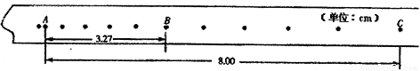 (8分)某试验小组利用拉力传感器和打点计时器验证牛顿运动定律,实验装置如图。他们将拉力传感器固定在小车上,用不可伸长的细线将其通过一个滑轮与钩码相连,用拉力传感器记录小车受到拉力F的大小;小车后面固定一打点计时器,通过拴在小车上的纸带,可测量小车匀加速运动的速度与加速度。若交流电的频率为10Hz,则根据下图所打纸带记录,小车此次运动经B点时的速度