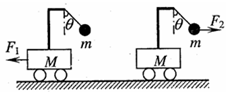 如上右图所示,两个完全相同的小车质量为,放在光滑的水平面上,小车横梁上用细线各悬挂一质量为