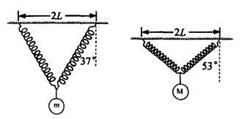 如图所示,将两根劲度系数均为k、原长均为L的轻弹簧,一端固定与水平天花板上相距为2L的两点,另一端共同连接一质量为m的物体,平衡时弹簧与竖直方向的夹角为37°。若将物体的质量变为M,平衡时弹簧与竖直方向的夹角为53°(sin37°=0.6),则
