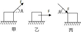 甲、乙、丙三个质量相同的物体均受到大小相等的恒力F,方向如图所示。三个物体均静止在水平地面上,且地面与物体间的动摩擦因数均相同,则 ( )![]()
