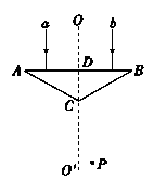 如图所示,ABC为等腰棱镜,a、b两束不同频率的单色光垂直AB边射入棱镜,两束光在AB面上的入射点到OC的距离相等,两束光折射后相交于图中的P点,以下判断正确的是( )![]()