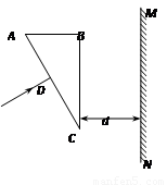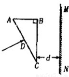 (6分)如图所示,有一截面是直角三角形的棱镜ABC,∠C=30°.在距BC边d处有一与BC边平行的光屏MN.现有某一单色光束从AC边的中点D垂直AC边射入棱镜.已知棱镜对该单色光束折射率为