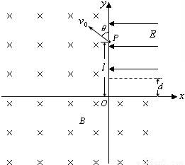 如图所示,在坐标系xOy中,第一象限除外的其它象限都充满匀强磁场,磁感应强度都为B = 0.12T、方向垂直纸面向内.P是y轴上的一点,它到坐标原点O的距离l = 0.40m.一比荷