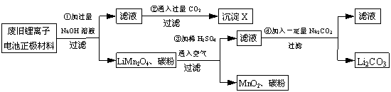 锂离子电池的广泛应用使回收利用锂资源成为重要课题。某研究性学习小组对废旧锂离子电池正极材料(LiMn2O4、碳粉行涂覆在铝箔上)进行资源回收研究,设计实验流程如下: