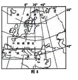 近年来,中国赴外游客数量急剧增长。2012年春节期间赴欧洲的中国游客在奢侈品上共花费72亿美元,占春节期间整个欧洲奢侈品销售总额的62%。欧洲拥有丰富的旅游资源,是世界上最活跃的旅游地区之一,按自然旅游风光大致可分为三大旅游区,即北欧、中欧和南欧旅游区。读图8,回答问题:
