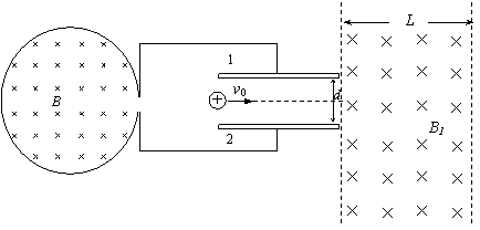 ⑴磁感应强度B从B0开始均匀增大时,试判断1、2两板哪板为正极板?磁感应强度随时间的变化率K=?