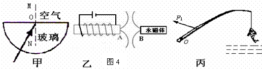 (1).如图4甲所示,入射光线从半圆形玻璃射向空气,在玻璃和空气的界面同时发生了反射和折射,请分别画出反射光线和折射光线(大致位置)。