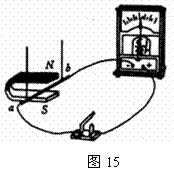 如图15所示,将一根导体棒ab的两端用细导线与灵敏电流计组成一个闭合电路,并用绝缘细线悬挂起来放在U形磁铁的磁场中。