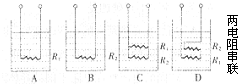 如图所示,已知电阻R1>R2,四个容器中水的质量相等,且初温相同,电路中电源电压相等,欲使四个容器中的水沸腾,需要的最少时间分别是tA、tB、tC、tD,则时间由少到多的排列顺序是(  )