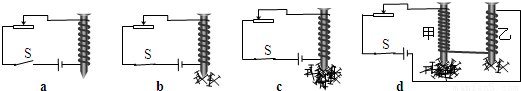 为了检验上述猜想是否正确,小丽所在实验小组通过交流与合作设计了以下实验方案:用漆包线(表面涂有绝缘漆的导线)在大铁钉上缠绕若干圈,制成简单的电磁铁.下图所示的a、b、c、d为实验中观察到的四种情况.根据小丽的猜想和实验,完成下面填空: