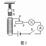 如图3所示,在电磁铁正上方用弹簧挂着一条形磁铁,开关闭合后,当滑片P从a端向b端滑动过程中,会出现的现象是( )