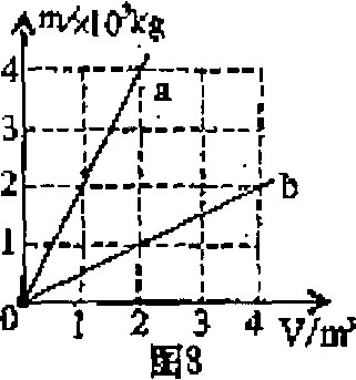 (08黄石)如母8所示,纵坐标表示物体的质最,横坐标表示物体的体积。图像a、b分别表示物体甲、乙的质量与体积的关系。由图像可知ρ甲:ρ乙=