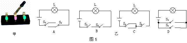 为了生活方便,卧室里的同一个照明灯通常用两个开关控制。一个安装在进门处,另一个安装在床头附近,操作任意一个开关均可以开灯、关灯。图5(乙)是小明设计的四个电路模型,能满足要求的是(A图中的Sl、S2及C图中的S1为单刀双掷开关——有三个接线柱,中间接线柱上接有金属片,可分别与左、右接线柱连通,连通一侧的同时会使另一侧断开,如图5甲所示,其电路图符号是
