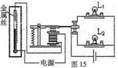 图15是一种温度自动报警器的原理图。在水银温度计里封入一段金属丝,当温度达到金属丝下端所指示的温度时,就可以发出报警信号。现将该装置设定为高温报警器,若报警灯为红色,正常状态指示灯为绿色,则灯L2应为 色。(选填“红”或“绿”)