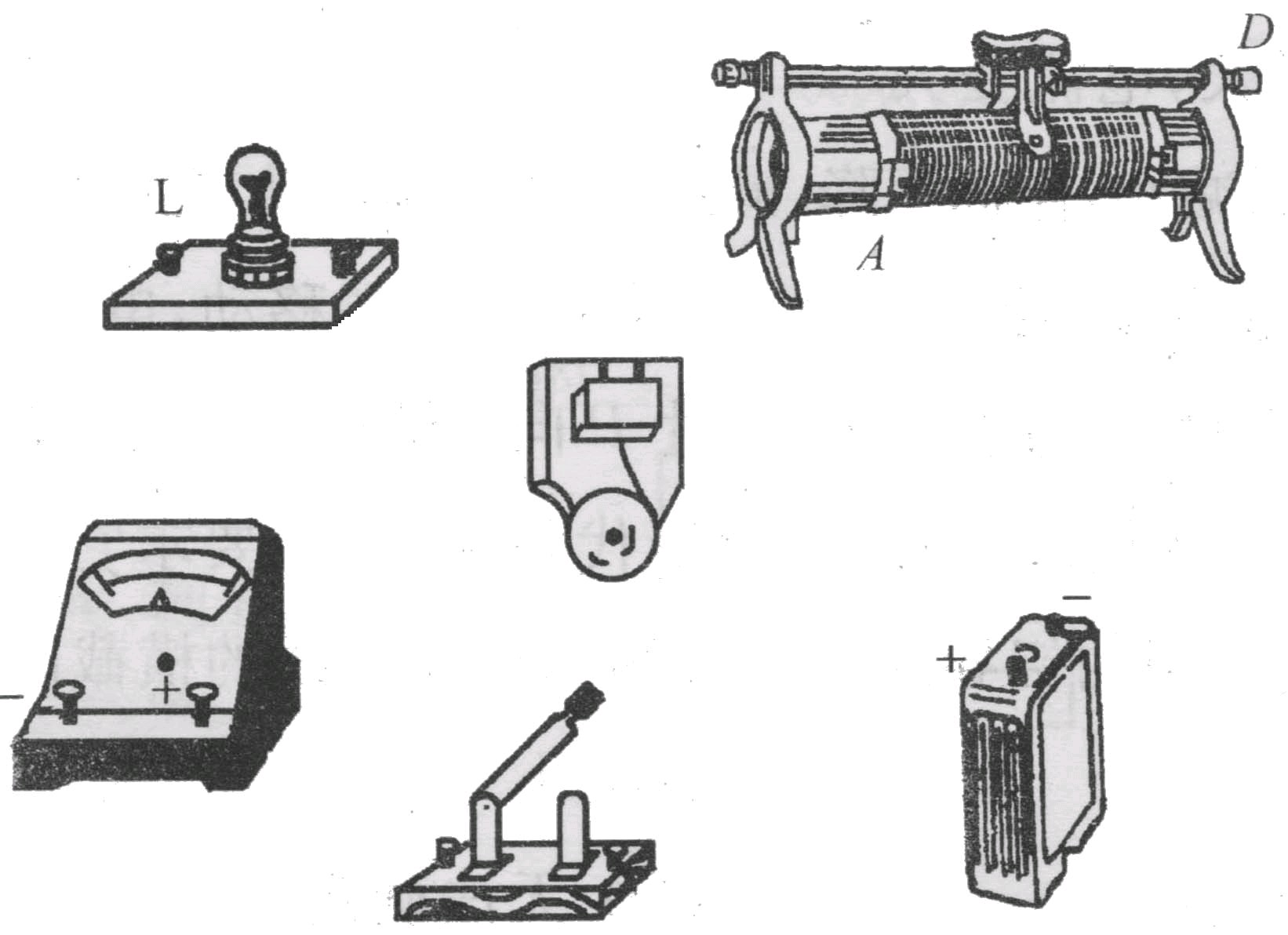 下图中给出了几种元件,在图上用笔连线表示导线把电路元件连接起来,要求L1与L2并联,且用滑动变阻器控制通过L1的电流.