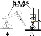 为了验证装在试管里的固态碘受热升华,甲同学直接将试管放在酒精灯火焰上,如图7甲所示;乙同学将试管浸入热水槽中,如图乙所示,两试管都会出现碘蒸气。已知:碘的熔点是114℃、沸点是184℃;水的沸点是100℃,酒精灯火焰温度约为400℃。下列说法正确的