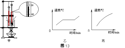 用图13甲所示的实验装置分别观察松香和海波的熔化过程,且每隔一定时间记录一次温度,直到两种物质全部熔化.图13甲试管中的海波不直接放到酒精灯上,而是浸没在烧杯的水中加热的目的是 。各组同学根据记录数据绘制了这两种物质的熔化图象,如17乙、丙两图所示,其中 图能反映松香的熔化过程。