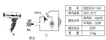 小华家买了一个家用电吹风,如图20甲所示。其简化电路如图20乙所示,主要技术参数如右表。