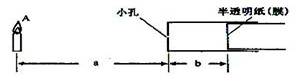 如图,点燃的蜡烛放在距小孔a处,它成像在距小孔b的半透明纸上,且a大于b。则半透明纸上的像是( )