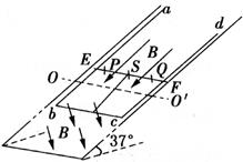 如图所示,倾角为37°的光滑绝缘的斜面上放着M=1kg的U型导轨abcd,ab∥cd。另有一质量m=1kg的金属棒EF平行bc放在导轨上,EF下侧有绝缘的垂直于斜面的立柱P、S、Q挡住EF使之不下滑。以OO′为界,下部有一垂直于斜面向下的匀强磁场,上部有平行于斜面向下的匀强磁场。两磁场的磁感应强度均为B=1T,导轨bc段长L=1m。金属棒EF的电阻R=1.2Ω,其余电阻不计。金属棒与导轨间的动摩擦因数μ=0.4,开始时导轨bc边用细线系在立柱S上,导轨和斜面足够长。当剪断细线后,试求: ![]()