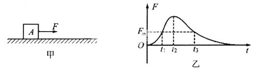 (2012年5月山东省济宁市二模)如图甲所示,静止在水平地面上的物块A,受到水平拉力F的作用,F与时间t的关系如图乙所示。设物块与地面间的最大静摩擦力Fm的大小与滑动摩擦力大小相等。则
