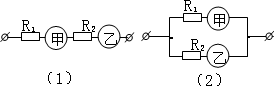 有甲乙两个不同的电流表,每个表的指针偏转与电流成正比且刻度均匀.把阻值为R1的电阻与甲表串联,阻值未知的另一电阻与乙表串联,把改装后的甲、乙两个电流表串联,接到电路A、B的两端,如图(1)所示,发现甲、乙两表的指针偏转格数分别是n1、n2,然后将这两个表并联,再接到电路A、B的两端,如图(2)所示,发现甲、乙两表的指针偏转格数分别是n3、n4,试求电阻R2的阻值.