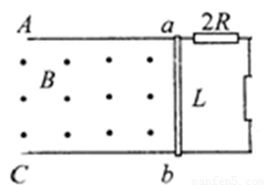 (9分)如图,在水平面内有两条电阻不计的平行金属导轨AB、CD,导轨间距为L;一根电阻为R的金属棒ab可在导轨上无摩擦地滑动,棒与导轨垂直,并接触良好,导轨之间有垂直纸面向外的匀强磁场,磁感强度为B,导轨右边与电路连接,电路中的两个定值电阻阻值分别为2R和R,现用力拉ab以速度v0匀速向左运动。求:![]()