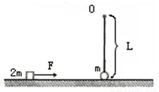 (18分)如图所示,长为L的不可伸长的绳子一端固定在O点,另一端系质量为m的小球,小球静止在光滑水平面上。现用大小为F水平恒力作用在另一质量为2m的物块上,使其从静止开始向右运动,一段时间后撤去该力,物块与小球发生正碰后速度大小变为原来的一半而速度方向不变,小球恰好能在竖直平面内做圆周运动。已知重力加速度为g,小球和物体均可视为质点,试求: ![]()