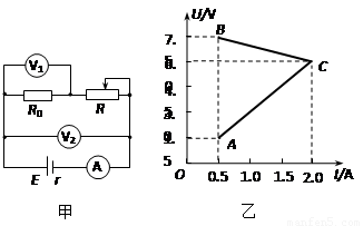 如图所示,甲图中变阻器的滑片从一端滑到另一端的过程中,两电压表的读数随电流表读数的变化情况如乙图中的AC、BC两直线所示。不考虑电表对电路的影响。