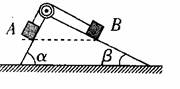 如图所示,A、B两物块用一根轻绳跨过定滑轮相连(不计滑轮的质量和摩擦) ,静止于斜面体两个光滑斜面上的相同高度处,两斜面的倾角分别为α=60°和β=30°。现剪断轻绳,A、B 沿斜面下滑且斜面体保持静止,则从剪断轻绳到两物块着地的过程中