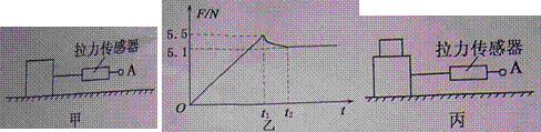 (10·杭州)如图甲所示,用一拉力传感器(能感应力大小的装置)水平向右拉一水平面上的木块,A端的拉力均匀增加,0 -tl时间木块静止,术块运动后改变拉力,使木块t2后处于匀速直线运动状态。计算机对数据拟合处理后,得到如图乙所示拉力随时间变化图线,回答下列问题: