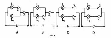 冲洗照片用的“曝光箱”内有红白两个灯泡并联,箱外有两个开关S1、S2根据需要,当先闭合S1时只有红灯L1发光,再闭合S2时红灯11和白灯12均发光;并要求在S1闭合前,即使先接通S2,L2也不发光.根据上述要求设计的四个电路中(如图2所示)正确的是( )