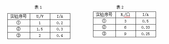 某同学用如图所示的电路研究通过导体的电流与导体两端的电压、导体电阻间的关系。若保持电源电压的大小和电阻箱R1的阻值不变,移动滑动变阻器R2的金属滑片P,可测得不同的电流、电压值,如表1所示。然后,他又改变电阻箱R1的阻值,测得相应的电流值,如表2所示。![]()