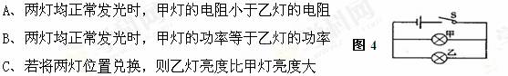 小琳同学在“探究影响电灯亮度的因素”时,用甲、乙两个小灯泡连成如图4所示的电路。闭合开关S后,甲、乙两灯均正常发光,但甲灯亮度比乙灯亮度大。下列说法不正确的是 ( )