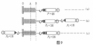 某中学初中年级同学在探究同一直线二力合成的实验中,把一根轻质弹簧的一端固定在O点,另一端用尼龙细线固定在弹簧秤的挂钩上,每次实验时,他们都将弹簧由A拉伸到B位置。研究过程及实验数据如图9(a)、(b)、(c)所示,请仔细观察图9中的装置、操作及现象,然后归纳得出初步结论。