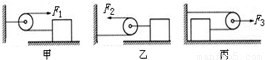 如图所示,用三种方法拉动同一物体在相同的水平地面上做匀速直线运动,使物体以相等速度移动相同的距离。所用拉力分别是F1、F2、F3,这三个力的作用点移动距离分别是S1、S2、S3,移动速度分别为V1、V 2、V 3,不计滑轮摩擦,则( )