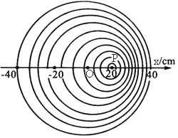 如图所示,让小球P一边贴水面每秒振动5次,一边沿x轴正方向匀速移动,O点是它的初始位置.图示为观察到的某一时刻的水面波,图中的实线表示水面波的波峰位置,此时小球P处于波峰位置,激起的第一个波峰刚好传动到40cm处,那么水面波的传播速度及小球P匀速移动的速度分别是
