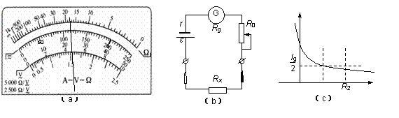 (2)多用电表测未知电阻阻值的电路如图(b)所示,电池的电动势为ε、内阻为r, R0为调零电阻,Rg为表头内阻,电路中电流I与待测电阻的阻值Rx关系图像如图(c)所示,