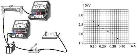 (2)改变滑动变阻器的阻值,测出了6组对应的数据并在图象上描点如图所示,请在右图中继续完成图象;并根据图象可得该电池的电动势E=________ V,电池内阻r=________