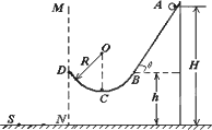 =53°,BD为半径R=4 m的圆弧形轨道,且B点与D点在同一水平面上,在B点,轨道AB与圆弧形轨道BD相切,整个轨道处于竖直平面内且处处光滑,在A点处的一质量m=1 kg的小球由静止滑下,经过B、C点后从D点斜抛出去,最后落在地面上的S点处时的速度大小vS=8 m/s,已知A点距地面的高度H=10 m,B点距地面的高度h=5 m,设以MDN为分界线,其左边为一阻力场区域,右边为真空区域,g取10 m/s2,cos53°=0.6.