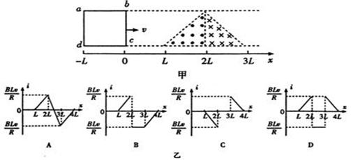 如图所示,有一等腰直角三角形的区域,其斜边长为2L,高为L。在该区域内分布着如图所示的磁场,左侧小三角形内磁场方向垂直纸面向外,右侧小三角形内磁场方向垂直纸面向里,磁感应强度大小均为B。一边长为L、总电阻为R的正方形导线框abcd,从图示位置开始沿x轴正方向以速度v匀速穿过磁场区域。取沿a→b→c→d→a的感应电流方向为正,则图乙中表示线框中电流i随bc边的位置坐标x变化的图象正确的是( )
