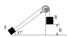 倾角θ=370的斜面体固定在水平地面上,一根轻绳跨过固定在斜面顶端的定滑轮,绳的一端与质量为ml="1" kg的物块A连接,且绳与斜面平行;另一端与质量为m2=3kg的物块B连接.开始时,用手按住A,使B悬于距地面高H=0.6m处,而A静止于斜面底端。如图所示.现释放B,试求此后A在斜面上向上滑行的最大距离? (设斜面足够长,且所有接触面间的摩擦均忽略不计,sin370=0.6,cos370=0.8,g取10m/s2)![]()