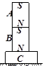如图所示,条形磁铁A、B质量均为m,C为木块,它们放在水平面上静止时,B对A的弹力为F1,C对B的弹力为F2,则与重力mg的关系是( )![]()