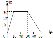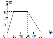 4.如图所示是一个物体运动的位移图.以下描述物体的运动正确的是:( ) A.在0--10s内沿正方向作匀加速直线运动 B.在10s--30s内沿正方向匀速运动 C.在10s--30s内物体的加速度为零 D.在30s--50s内物体沿反方向作匀减速运动 查看更多