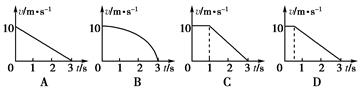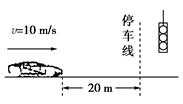 如图所示,汽车以10 m/s的速度匀速驶向路口,当行驶至距路口停车线20 m处时,绿灯还有3 s熄灭.而该汽车在绿灯熄灭时刚好停在停车线处,则汽车运动的速度(v)—时间(t)图象可能是( )![]()