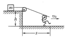 如图所示,高为h的光滑平台上有一质量为m的物块,用绳子跨过定滑轮由地面上的人以速度v0向右拉动,当人从平台的边缘处向右匀速前进了s的距离(不计绳的质量以及绳与滑轮间的摩擦),则[ ]