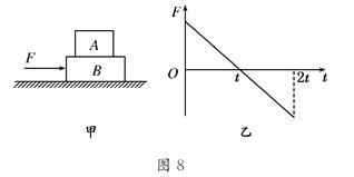 如图甲所示,A、B两物体叠放在光滑水平面上,对B物体施加一水平变力F,F-t关系图象如图8乙所示.两物体在变力F作用下由静止开始运动,且始终相对静止,则 ( )