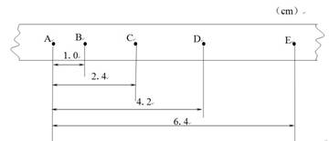 在用打点计时器研究匀变速直线运动规律的实验中每隔0.02s打一个点,每隔5个连续点取一个计数点,计数点A、B、C、D、E的位置如图所示,则物体运动的加速度为___________m/s2,C点时刻的速度为 m/s。![]()
