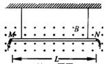 如图所示,两根等长的绝缘细线悬挂一水平金属细杆MN,处在与其垂直的水平匀强磁场中.金属细杆的长度为1 m,质量为8.9×10-3 kg.当金属细杆中通以0.89 A的电流时,两绝缘细线上的拉力均恰好为零.忽略与金属细杆连接细导线的影响.求: