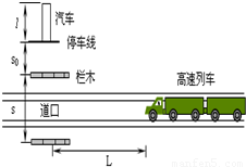 为了确保安全,在铁路与公路交叉的道口处需装自动信号灯。当列车还有一段距离才到达公路道口时,道口应亮出红灯,警告未越过停车线的汽车迅速制动,已越过停车线的汽车赶快通过。如果汽车通过道口的速度,停车线至栏木的距离s0=5m,道口宽度s=26m,汽车长l=15m,如图所示。并把火车和汽车的运动都看作是匀速直线运动。试求:若列车的速度,列车离道口的距离L为多少时亮红灯,才能确保已越过停车线的汽车安全驶过道口?